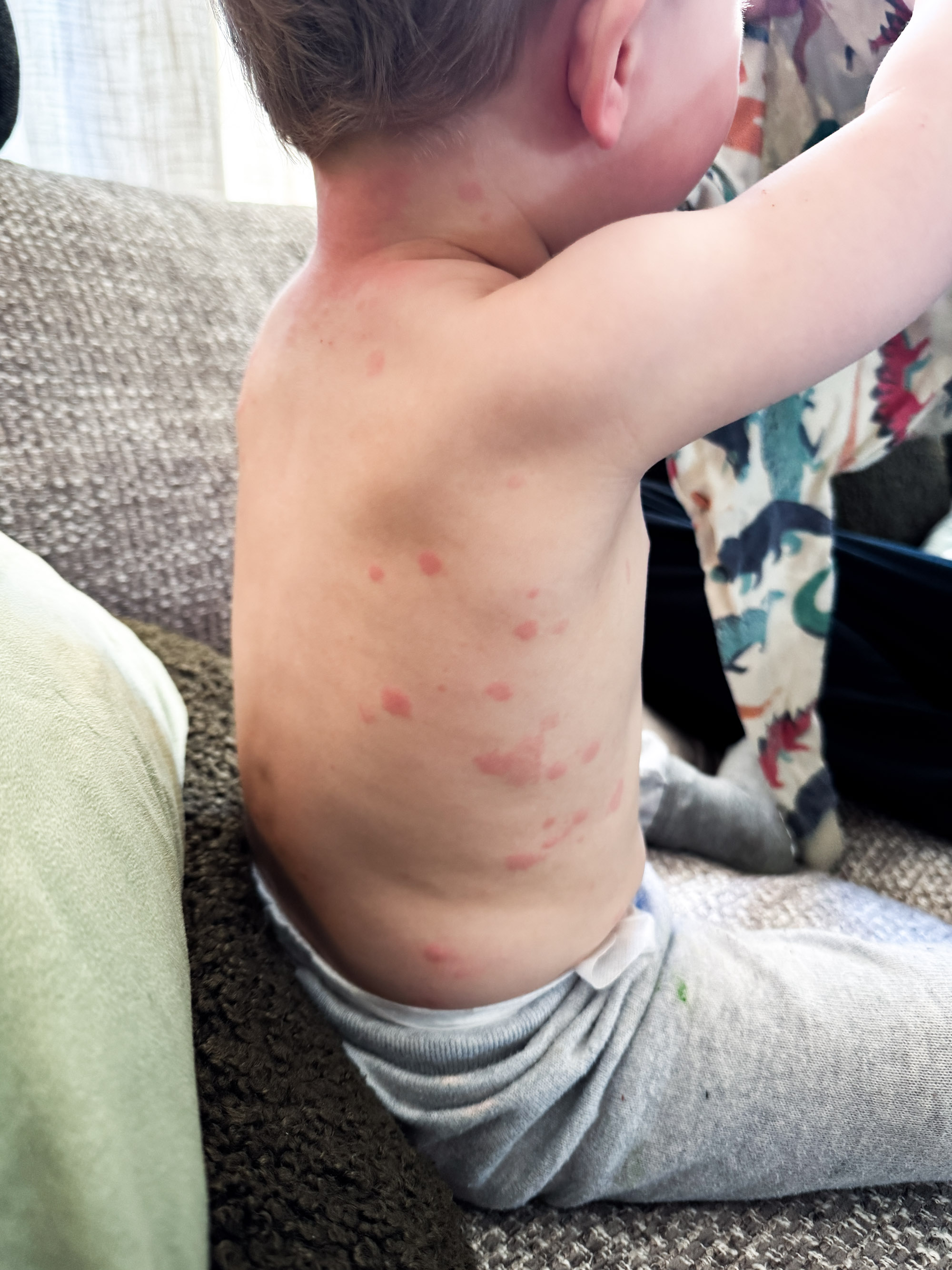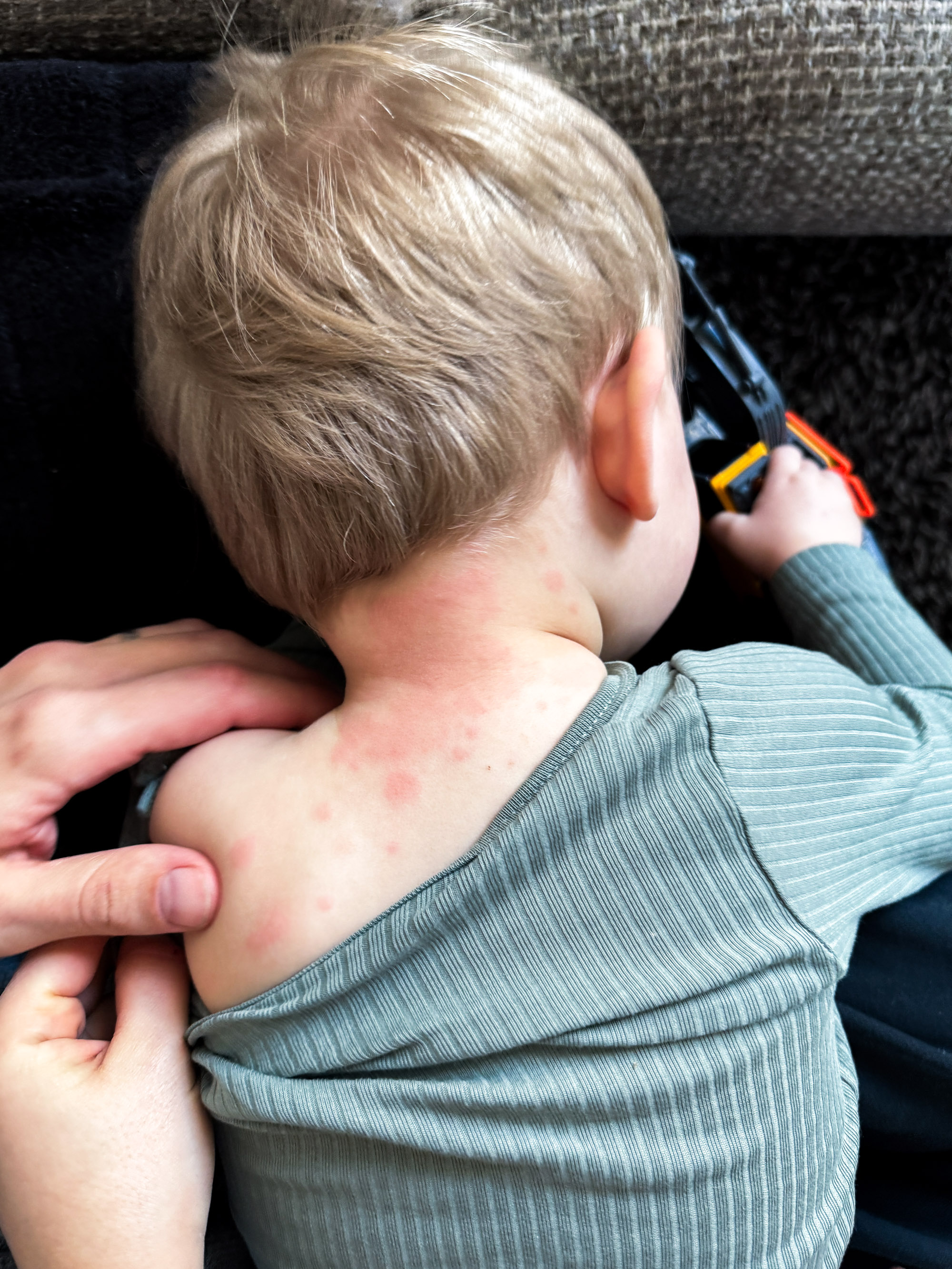 Vaknade upp till en Adam som var alldeles rödflammig i nacken – värmeutslag, tänkte vi – och gick ner för att äta frukost och förbereda honom för förskolan.