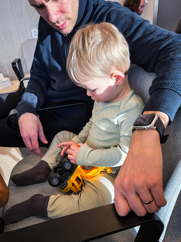 Adam vägrade äta och dricka innan vi åkte iväg och i väntrummet kämpade vi med att få i honom lite banan… Men, är man så där sjuk vill man förmodligen inte äta heller.