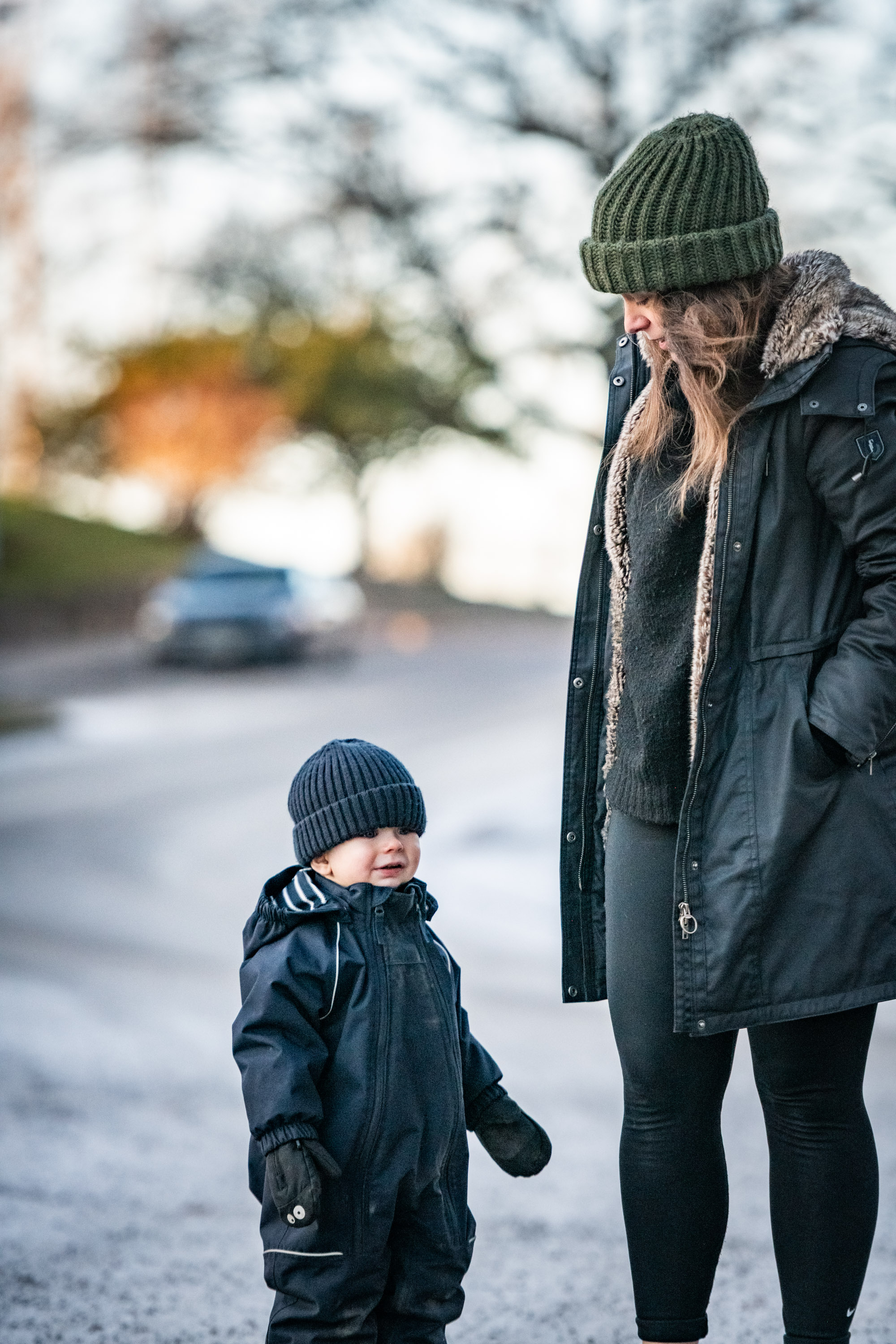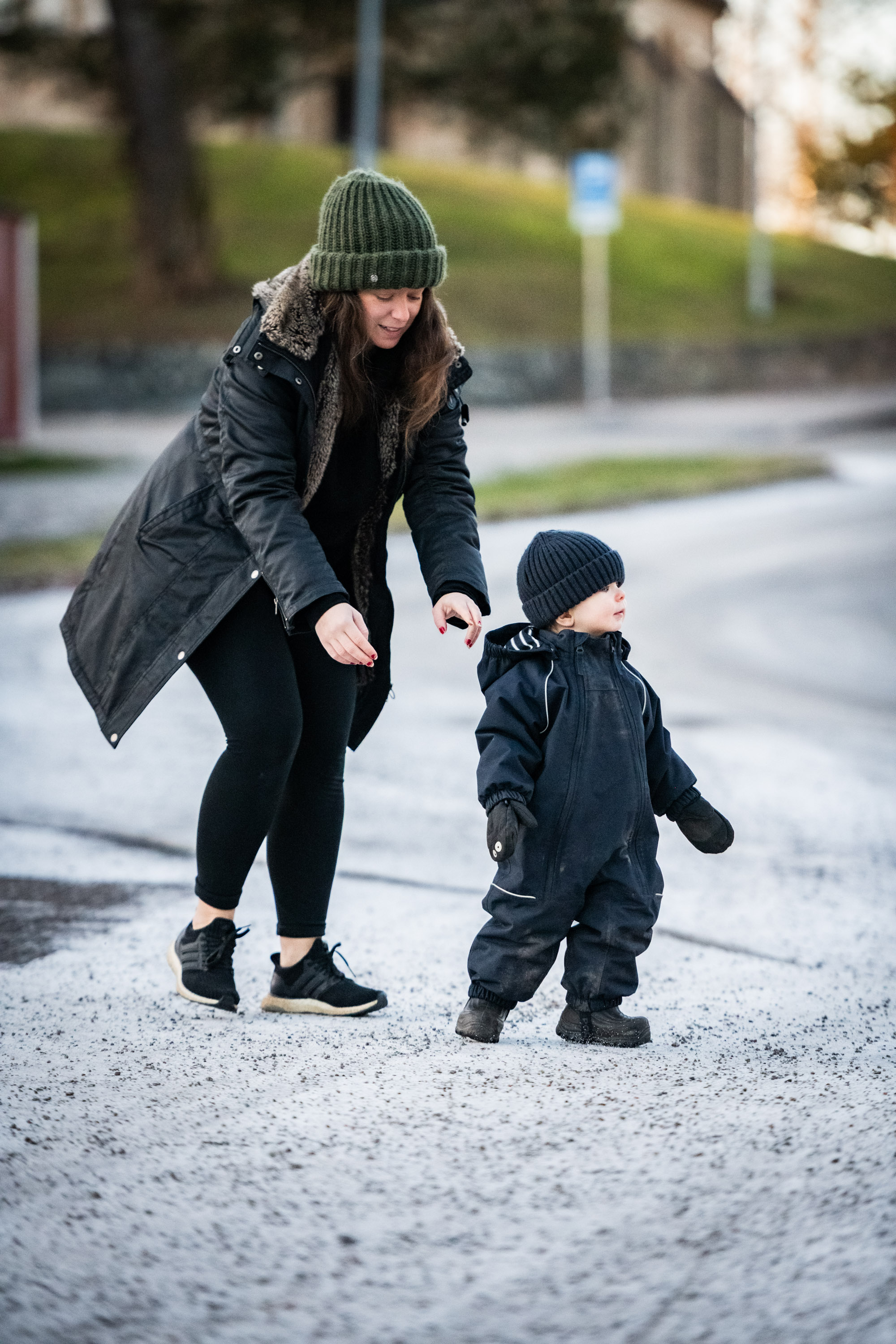 Adam var väl lite sisådär gnällig, men han förstod att vi skulle ut i snön och verkade ändå ganska okej med att jag klädde på honom lager på lager. När vi skulle ta oss ner för vår lilla backa till bussen, höll jag på att sitta på rumpan både två och tre gånger, det var så jävla halt! Blankis och snömodd ovanpå, helt otroligt att det inte varit någon olycka där än.