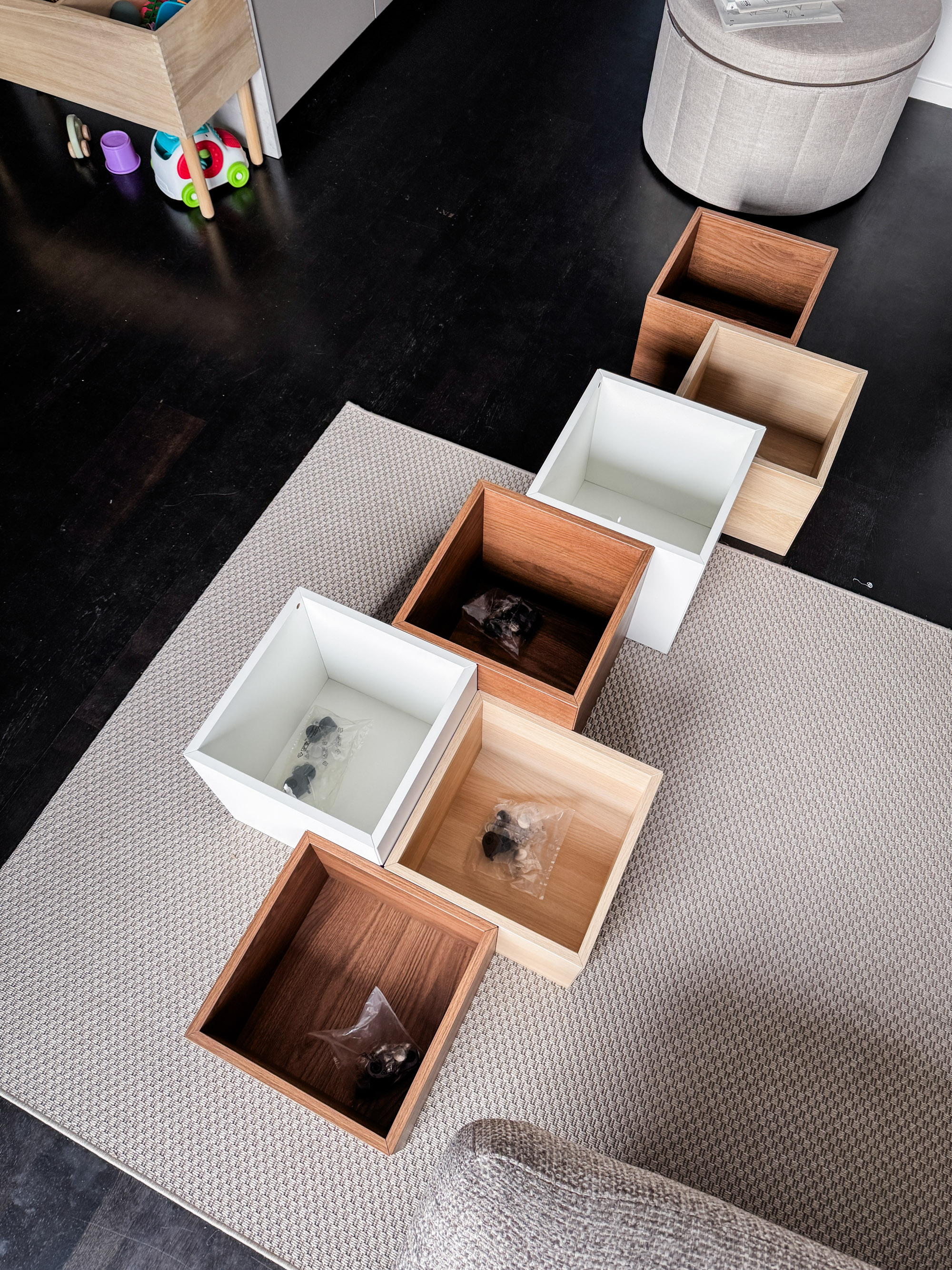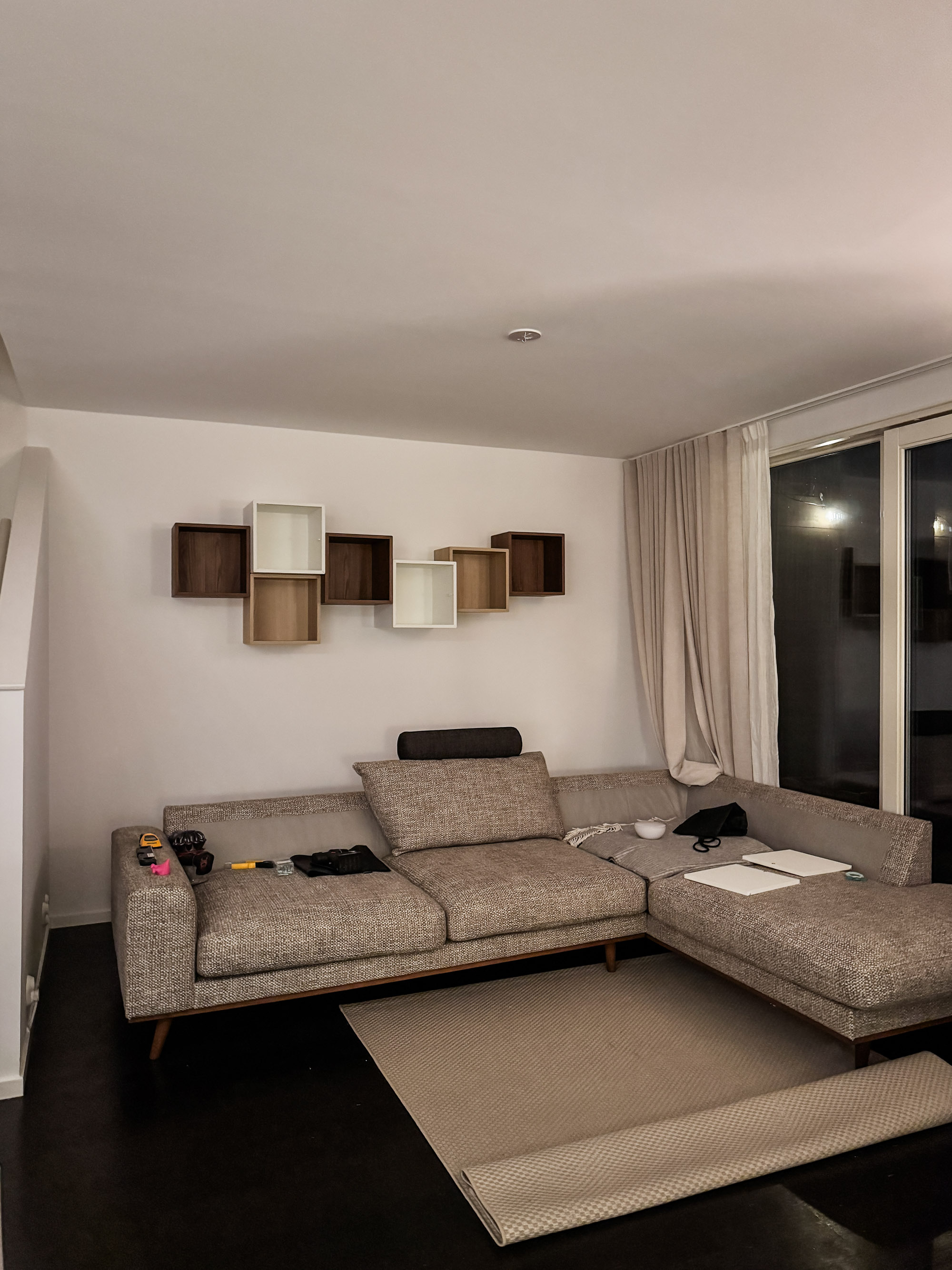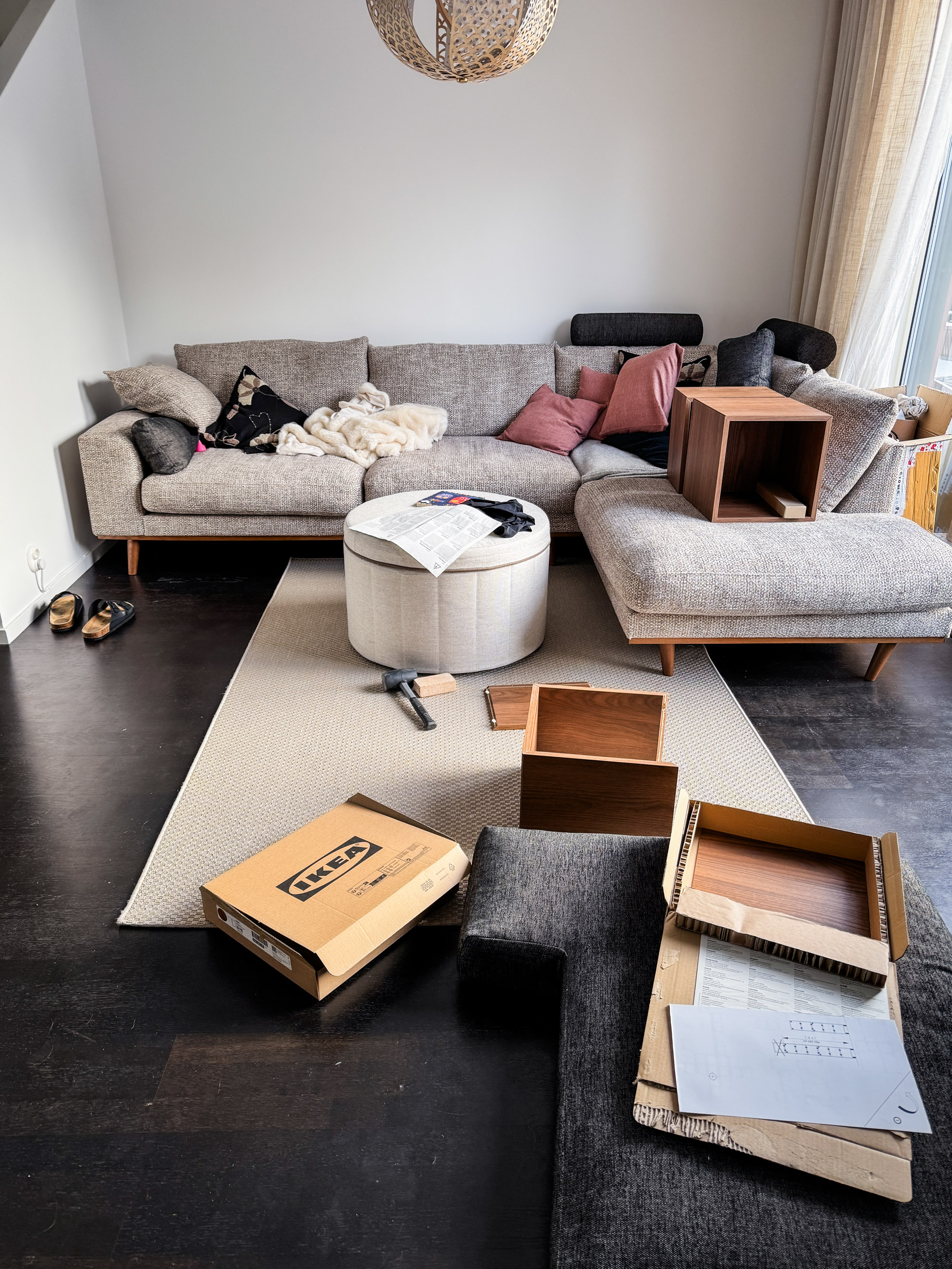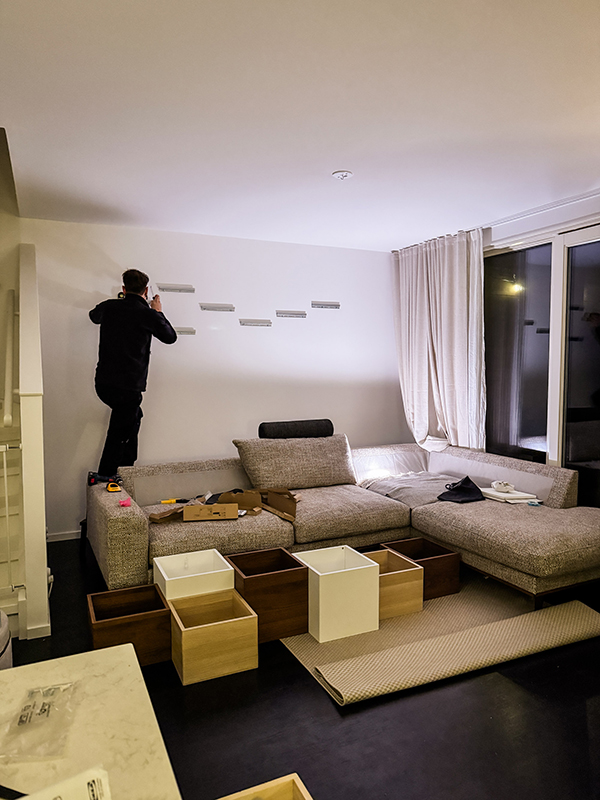 Under Adams första sovstund för dagen, passade jag på att bygga ihop alla delar till hyllan. När Adam vaknade igen efter dryga 40 min, stannade allt upp en stund ^^ Det dröjde ett par timmar, men under Adams andra sovstund hann vi mäta upp vart alla skruvar i väggen skulle sitta. När Adam vaknade, stannade allt av igen… Herregud vilken tid allting tar med barn, så trött på det.