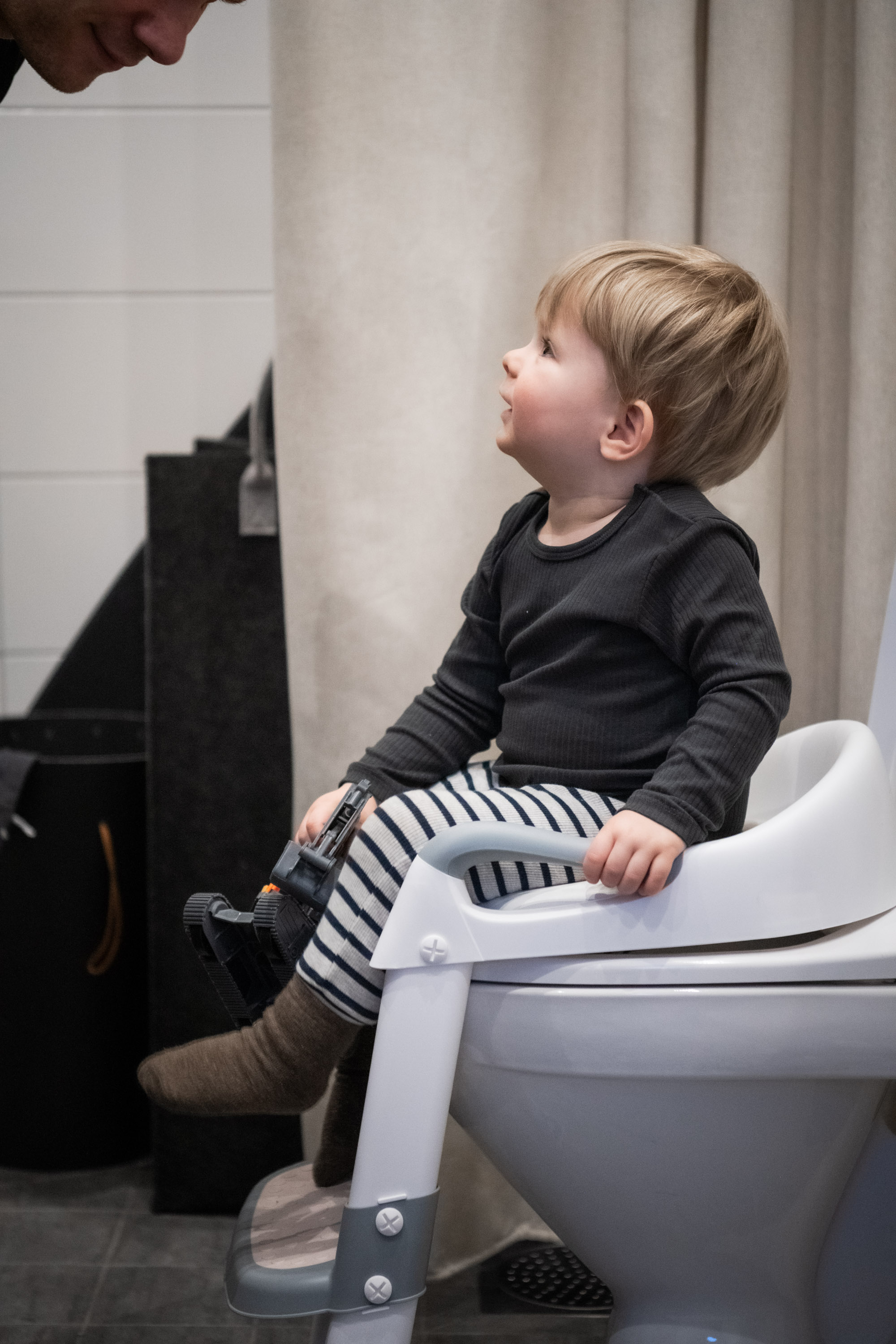 Därför har vi ställt in hans potta i duschen så att han kan stänga in sig själv bakom duschdörrarna för lite privacy ^^ Och det har blivit lite av en rutin att vi går på toa “tillsammans”, nästan 100% success rate på det. Men, han har hittils bara suttit på den med kläderna på…