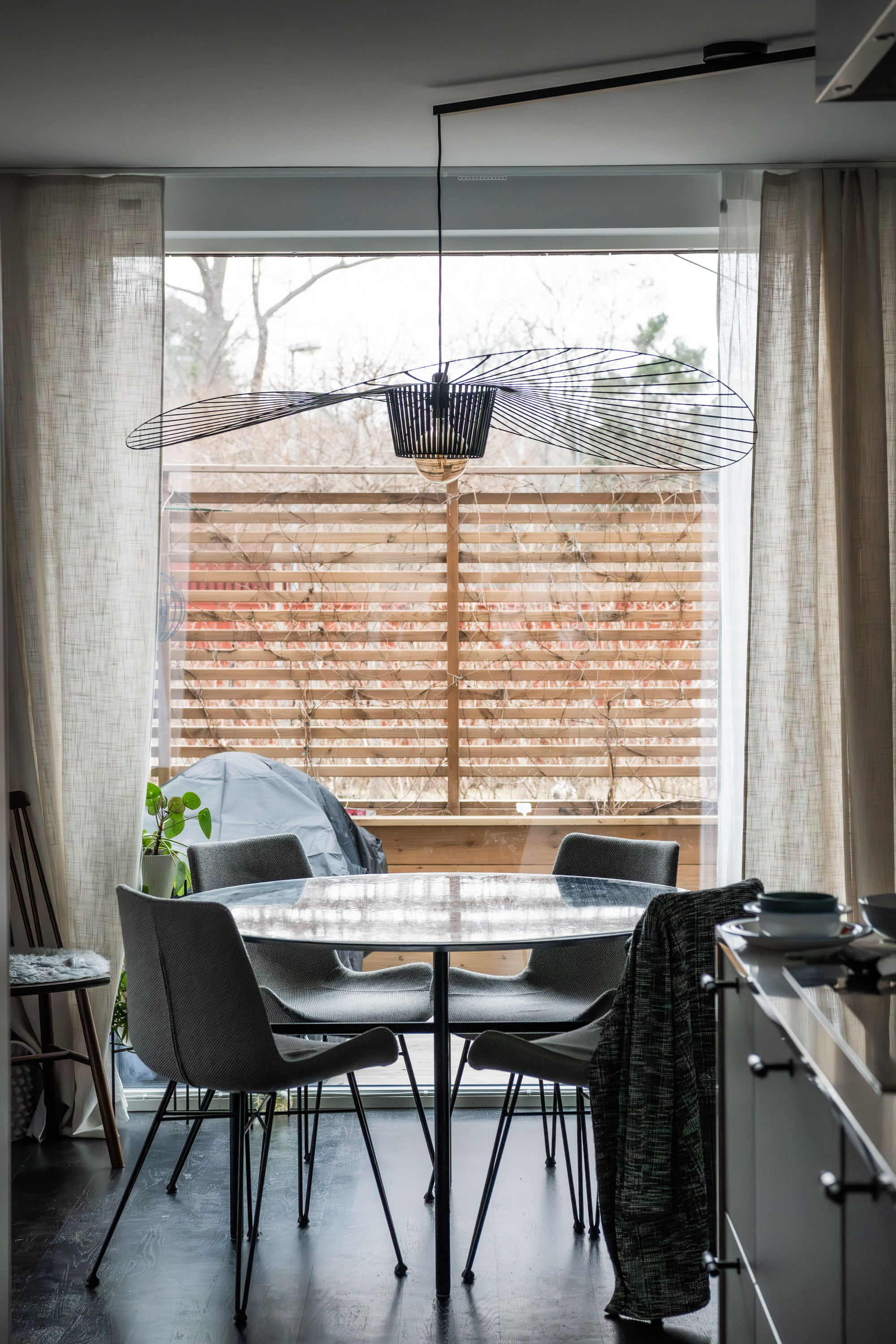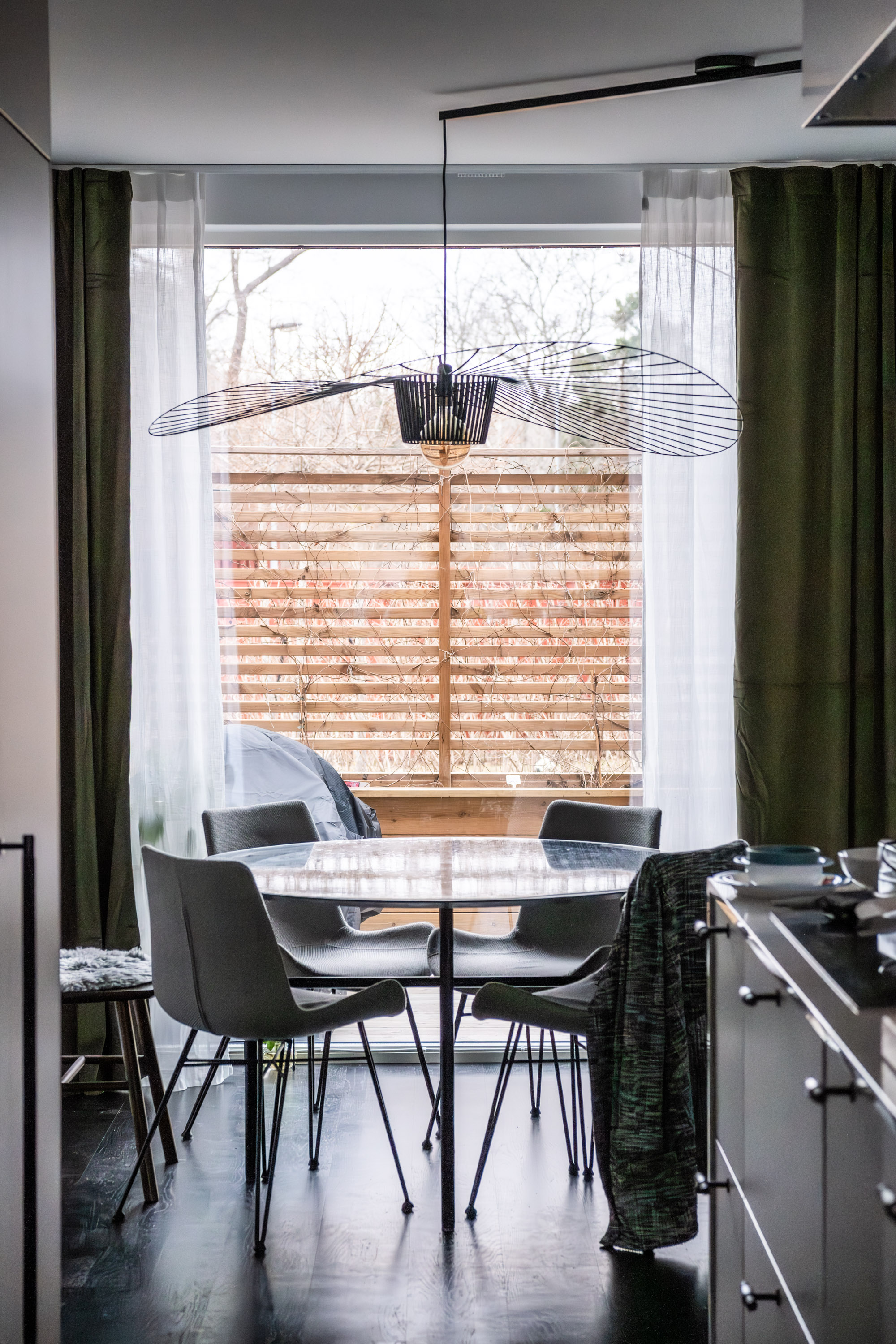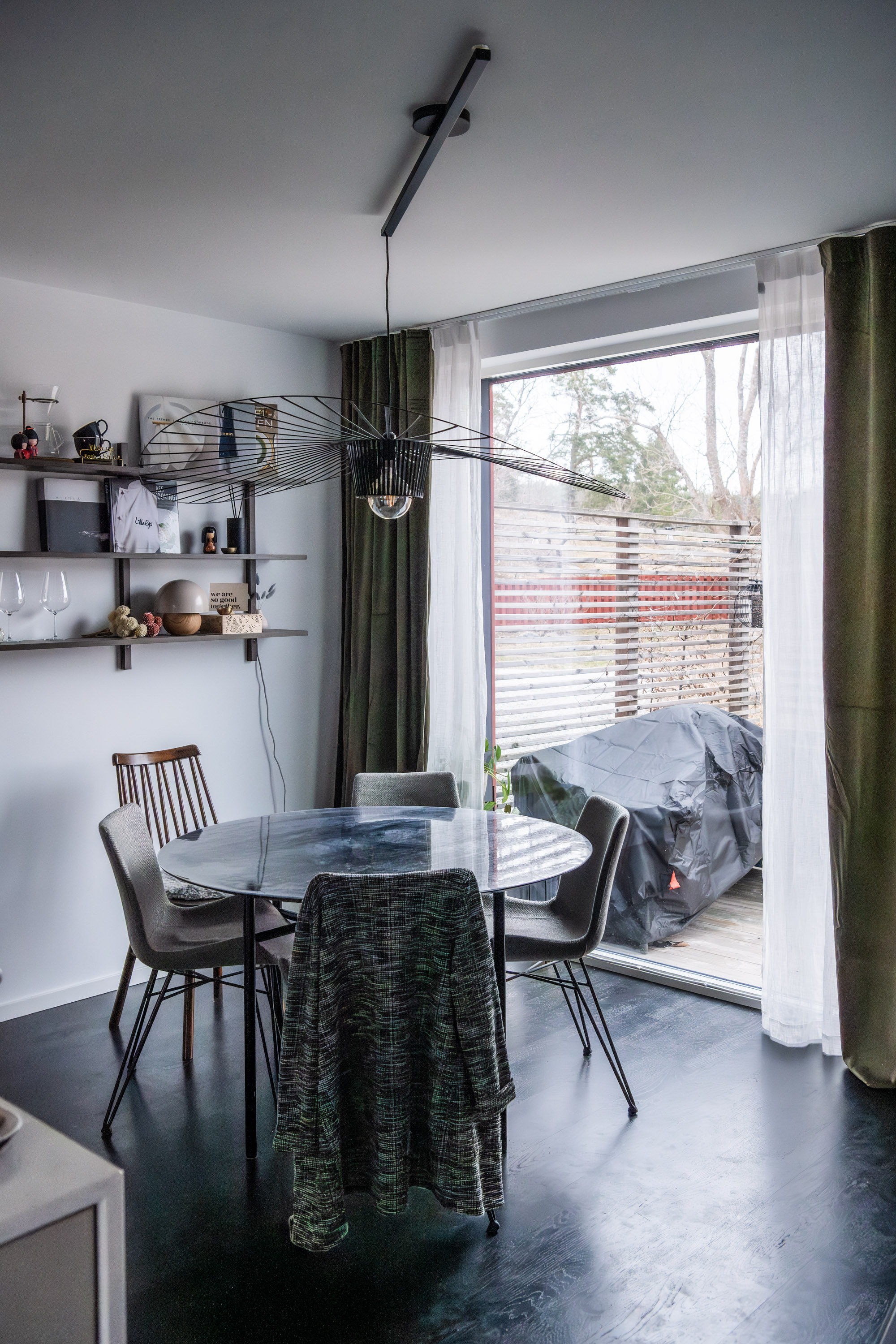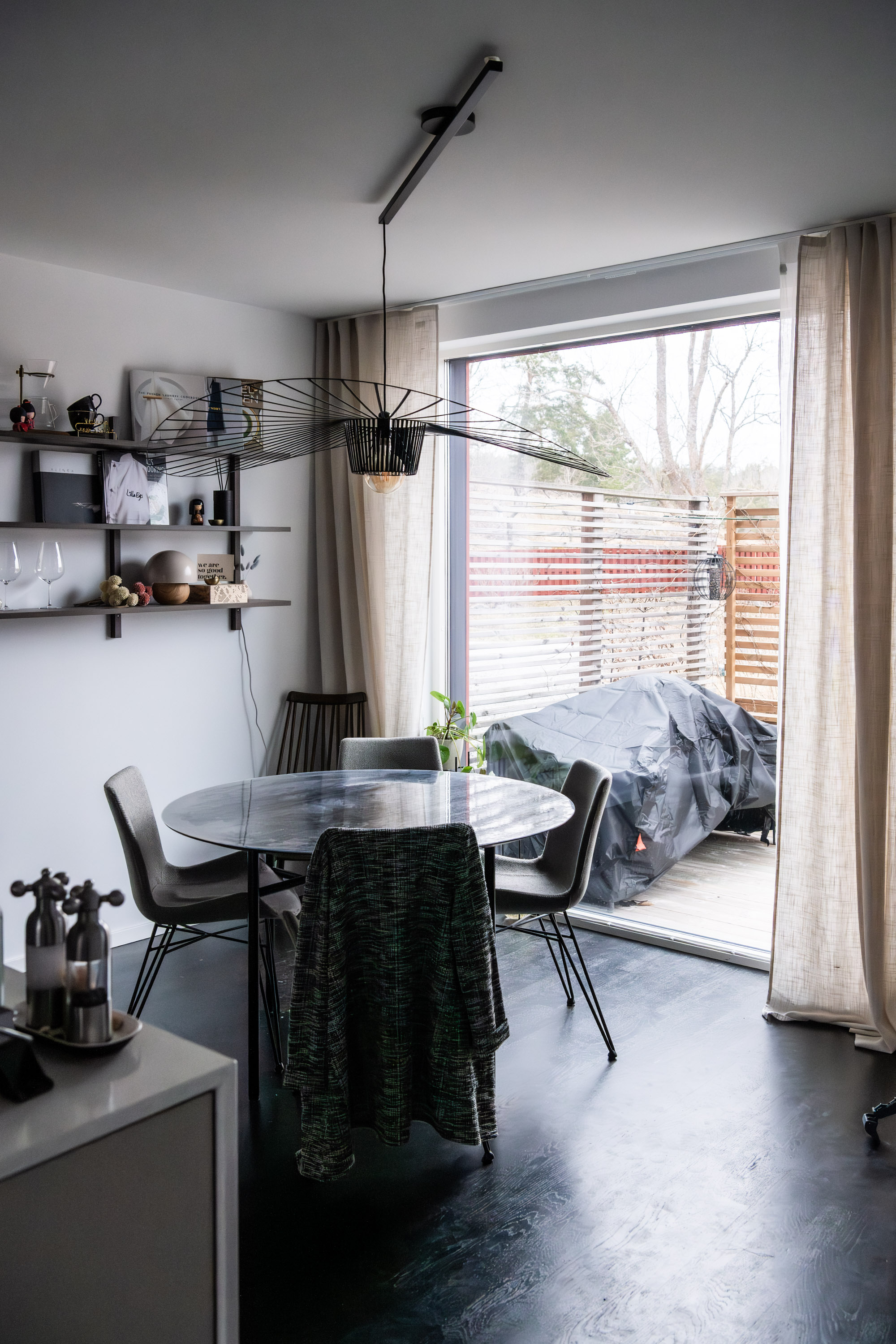 När jag fick lite tid över på lunchen idag passade jag på att sy de sista gardinlängderna. Därefter hängde jag upp dem för att se hur det blev och ja, jag tyckte iaf att det blev mycket bättre. Tidigare saknades kontrast här inne. Nu bryter de mörka gardinerna av på ett schysst sätt och nedervången kändes genast lite mer ombonat. Hängde även upp gardiner bakom vitrinskåpet och det gjorde jättestor skillnad.