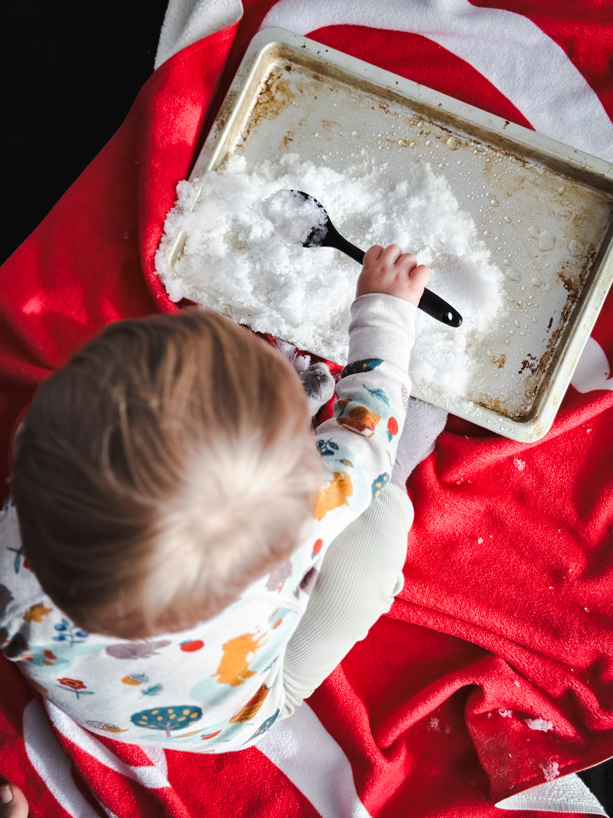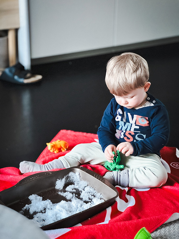 För att underhålla en väldigt understimulerad Adam, tog jag in lite snö till honom som han kunde leka med. Det skopades, byggdes torn, smakades på... Men han såg även till att krokodilen fick sitt, oj va han lekte med den ^^